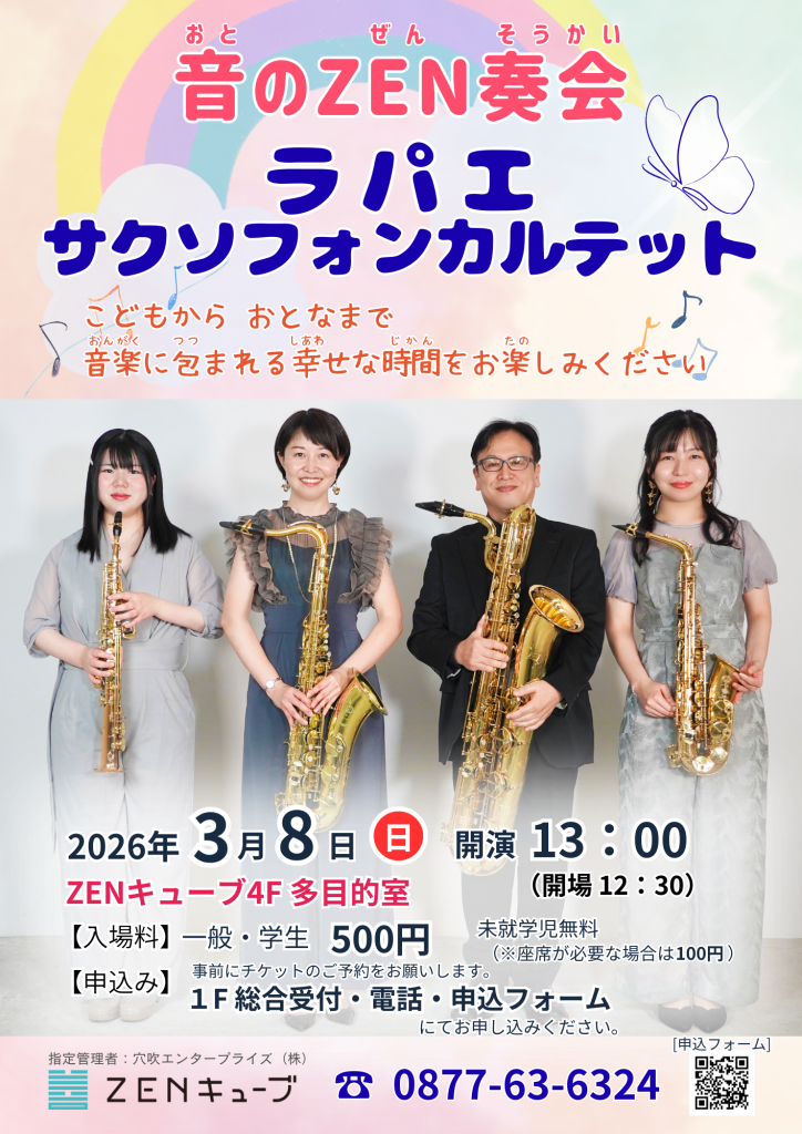 『音のZEN奏会』ラパエサクソフォンカルテット 13:00開演(12:30開場)