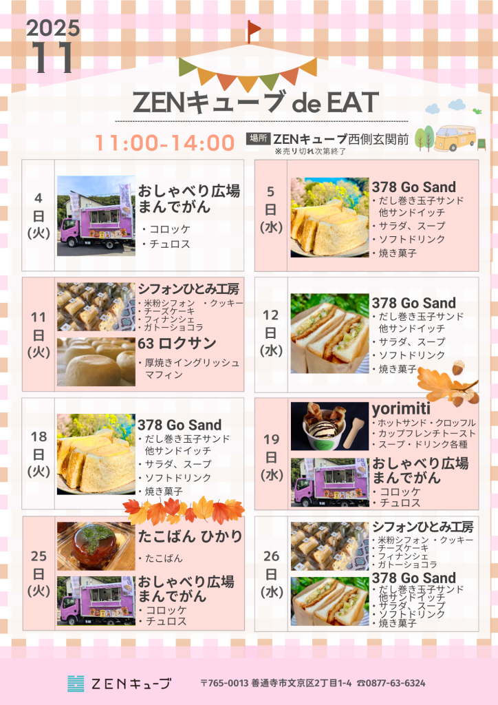キッチンカーがZENキューブ西側玄関前に登場する「ZENキューブde EAT」の11月の出店者様については上記画像をご覧ください!