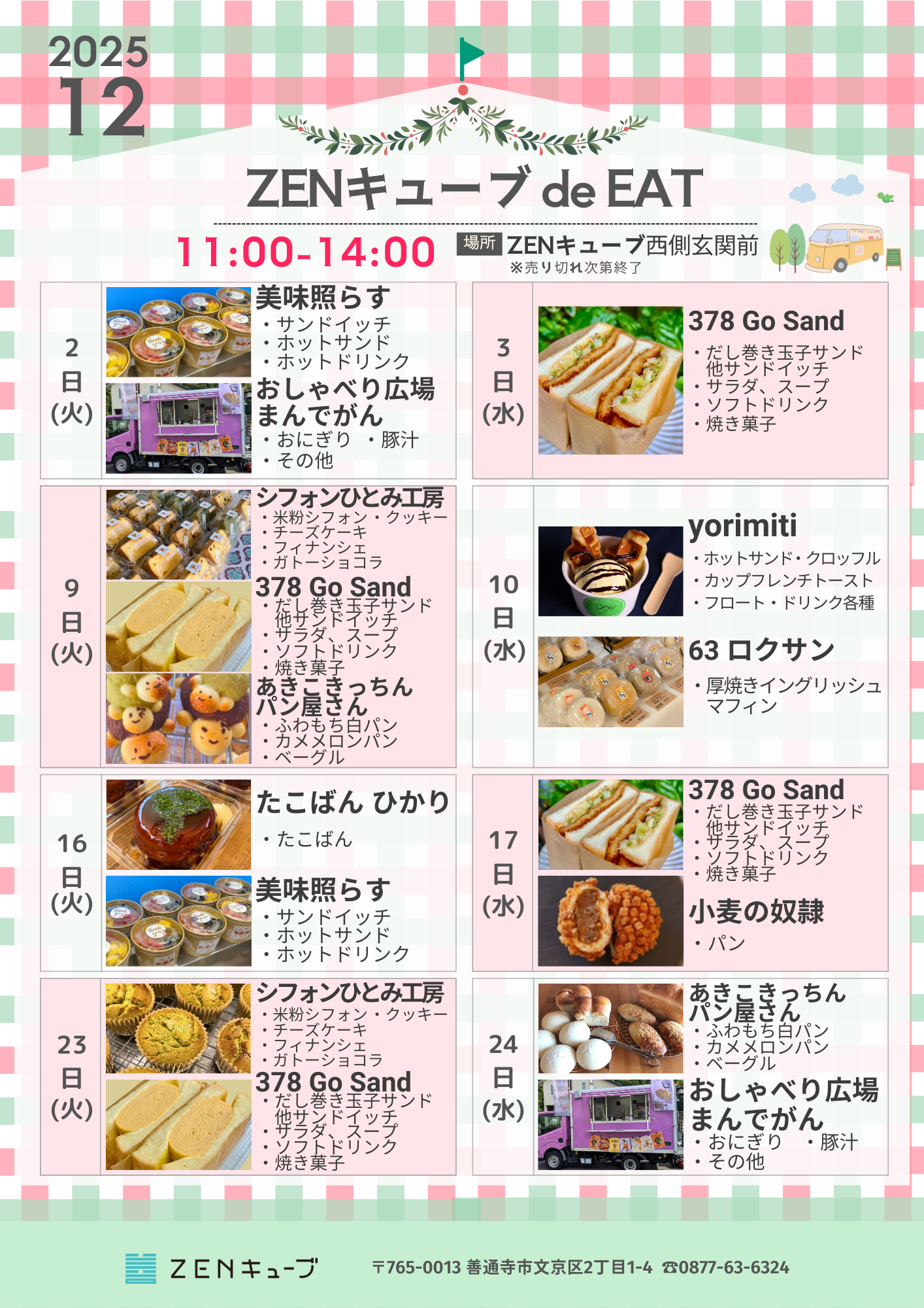 キッチンカーがZENキューブ西側玄関前に登場する「ZENキューブde EAT」の12月の出店者様については上記画像をご覧ください!
