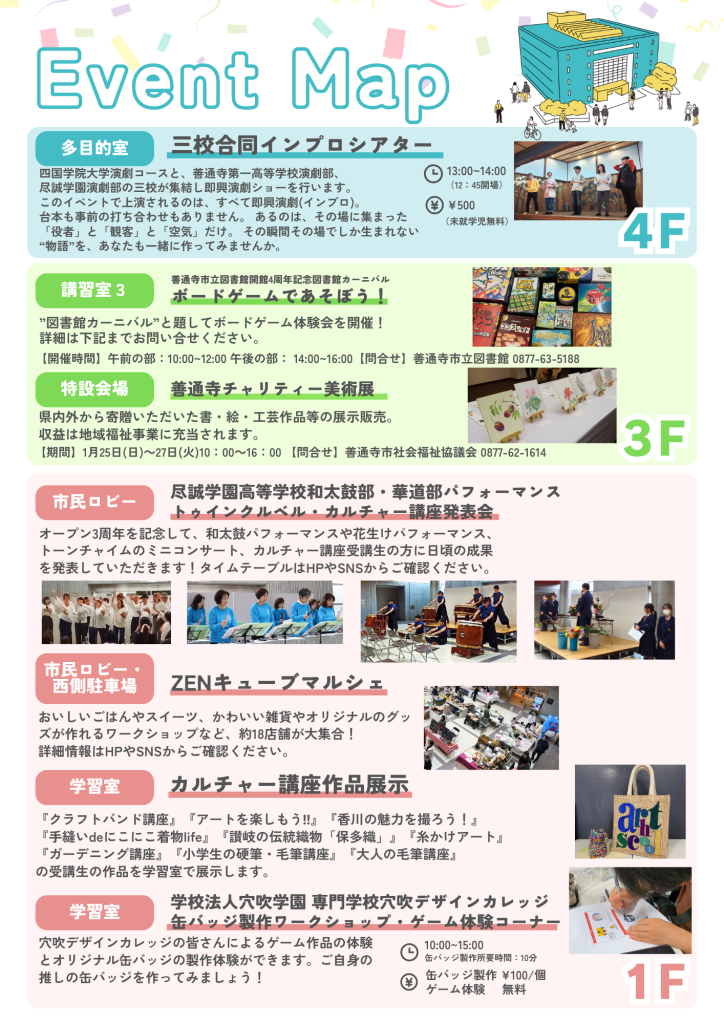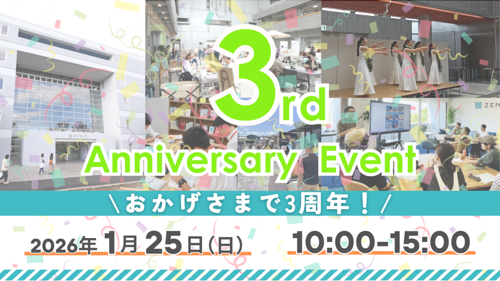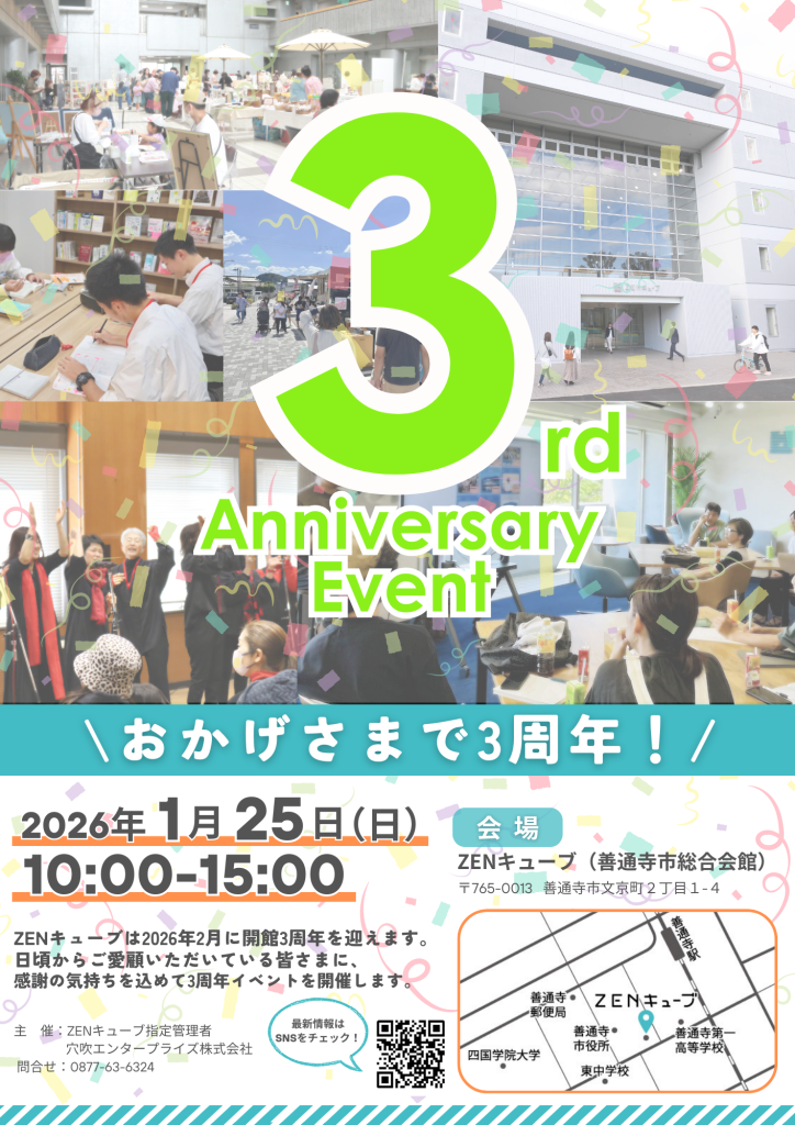 【2026.1.25】ZENキューブ開館3周年記念イベントイベント 日時 2026年1月25日(日)10:00〜15:00 場所 ZENキューブ1F市民ロビー・学習室、4F多目的室、西側駐車場※駐車場はZENキューブ南側駐車場又は善通寺市役所駐車場をご利用ください。 概要 「ZENキューブ開館3周年記念イベント」 この度、ZENキューブは2026年2月に開館3周年を迎えます。日頃からご愛顧いただいている皆さまに、感謝の気持ちを込めて3周年イベントを開催します。 イベント詳細